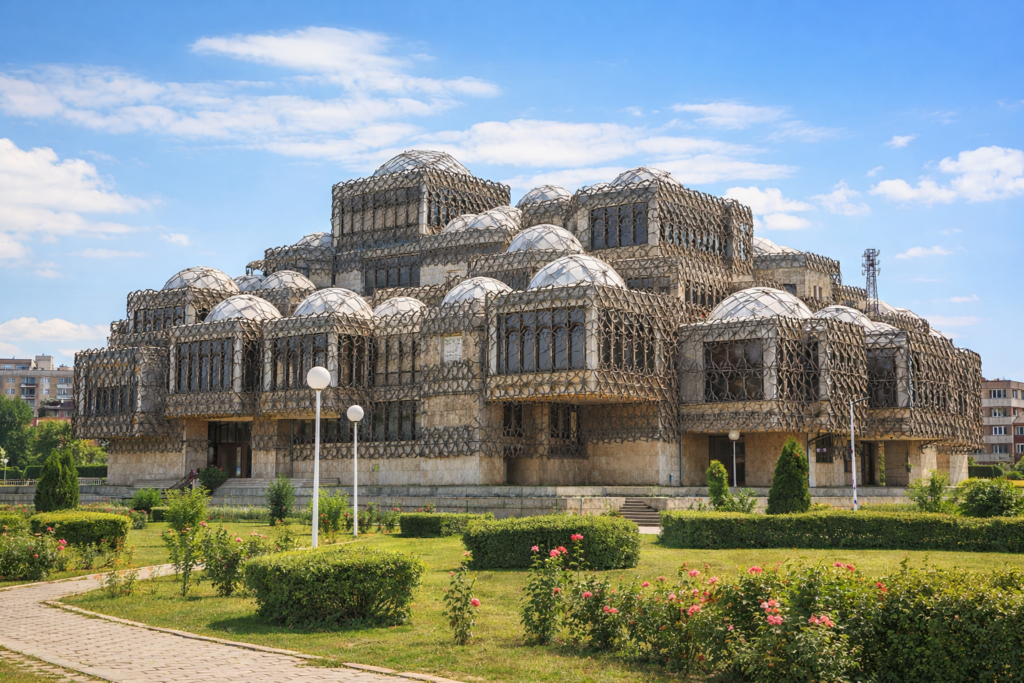 Priştine’de mimariye ilgi duyanların mutlaka görmesi gereken yapılardan biri Ulusal Kütüphane’dir. Kubbe formu ve metal kafes dış cephesiyle oldukça sıra dışı bir görünüme sahiptir. Bu özgün tasarım, yapıyı hem tartışmalı hem de unutulmaz kılar.